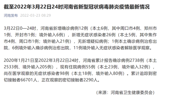 2020年1月21日至2022年3月22日24时,河南省累计报告确诊病例2738例(本土2533例、境外输入205例),现有住院病例55例(本土23例,境外输入32例),尚在医学观察的无症状感染者98例(本土18例,境外输入80例)。累计追踪到密切接触者66701人,正在观察的密切接触者2290人。
