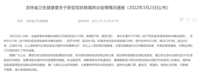 荔枝新闻讯 据吉林省卫健委网站消息,3月22日0-24时,全省新增本地确诊病例2320例(轻型2310例、普通型7例、重型3例),其中长春市1979例(含57例无症状感染者转为确诊病例)、吉林市331例(含16例无症状感染者转为确诊病例)、四平市9例、延边州1例。新增本地无症状感染者528例,其中吉林市522例、梅河口市3例、延边州2例、辽源市1例。以上感染者均已转运至定点医疗机构隔离治疗,对以上人员的密切接触者、次密切接触者均已开展追踪排查,并落实管控措施,对其生活和工作场所进行了终末消毒。