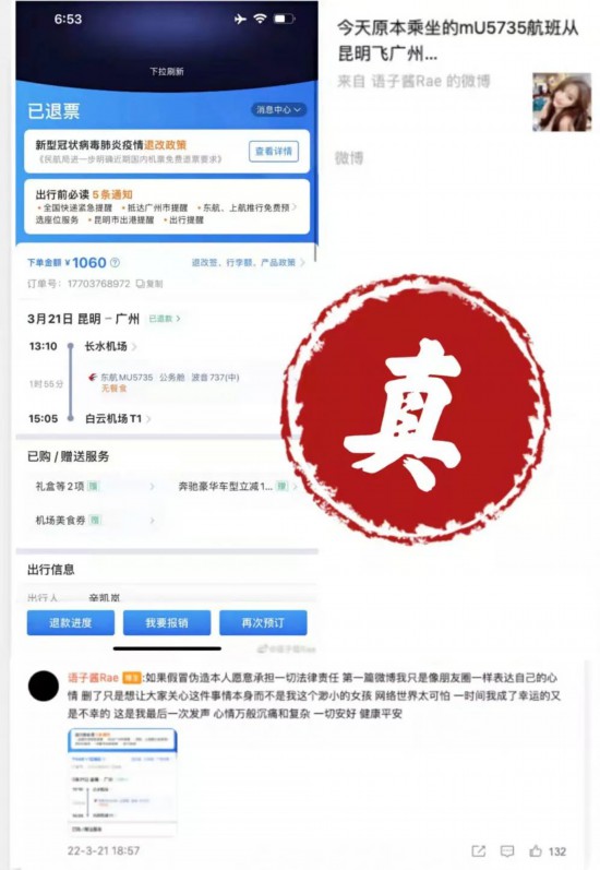MU5735航班被证实失事后,网上开始流传出两条信息:一条是东航发送的MU5735航班座位预留短信,一条是MU5735航班的退票信息截屏。随后,传出有两人没有登上这班飞机。