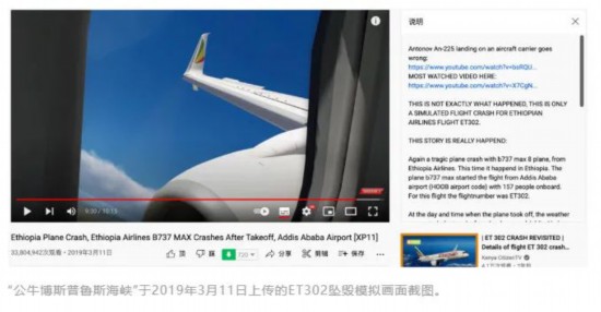可见,网传“东航MU5735客机坠毁第一视角影像”具有误导性,实为对埃塞俄比亚航空ET302空难事件的模拟画面,由YouTube博主“公牛博斯普鲁斯海峡”上传。2019年3月,ET302在执行从埃塞俄比亚首都亚的斯亚贝巴至肯尼亚首都内罗毕的飞行任务时坠毁,造成157人丧生。