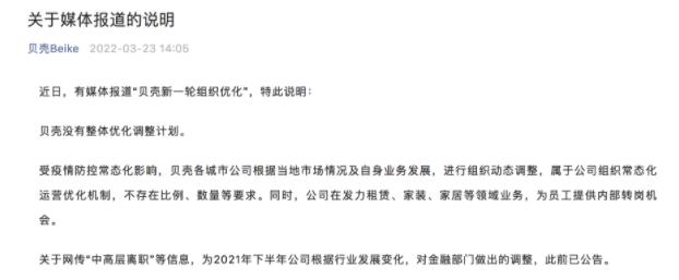 荔枝新闻讯 针对“贝壳进行新一轮裁员”的消息,3月23日,贝壳通过微信公众号回应称,贝壳没有整体优化调整计划。