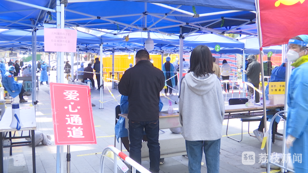 该检测点有四个核酸检测的通道,其中最内侧是爱心通道,主要是为“一老一小”快速提供核酸检测。