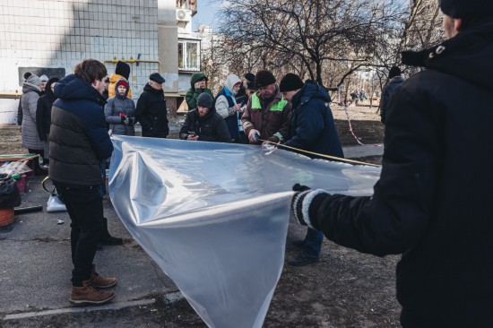 3月17日,人们在乌克兰基辅领取用来遮挡窗户的塑料布。新华社发(迭戈·埃雷拉摄)