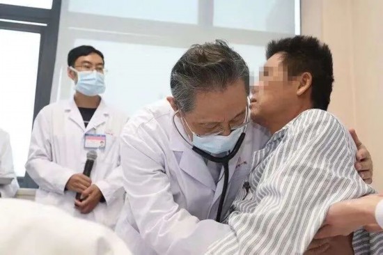 在为患者做听诊检查时,钟南山俯下身子用手轻轻托住她的后背,帮助她坐起来,用手将听诊器捂热再放到患者的身体上,这已经成为他从医60多年的“习惯”。