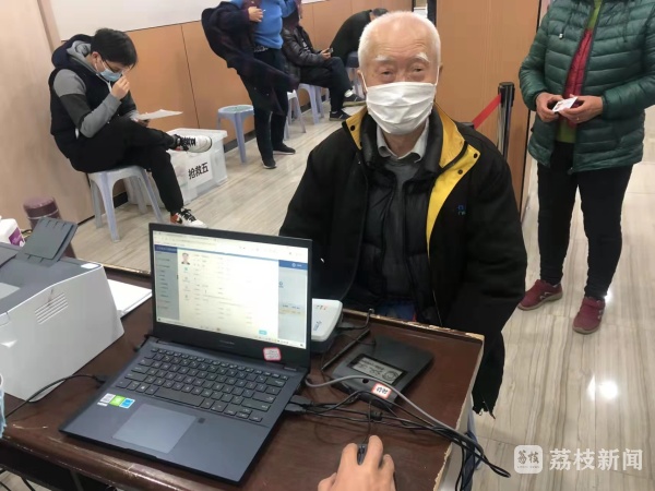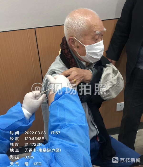 我苏网讯 3月23日傍晚,89周岁的老人王福康来到无锡市南星苑第三社区接种第一针新冠疫苗。