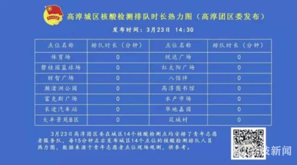 为便于广大市民错峰安排核酸检测,高淳区全区核酸检测期间,高淳团区委依托点位青年志愿者实时数据反馈,每半小时发布区域内各采样点排队人员“热力图”,受到广大市民点赞。