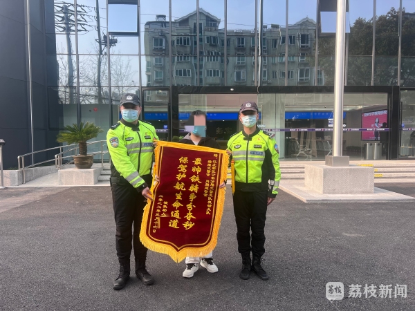 3月23日下午,南京市民陶先生将一面印有“最帅铁骑争分夺秒 保驾护航生命通道”的锦旗送到南京市公安局江北新区分局交警支队机动大队,感谢铁骑队员早高峰期间紧急开道,护送其即将临产的妻子顺利赶到医院。