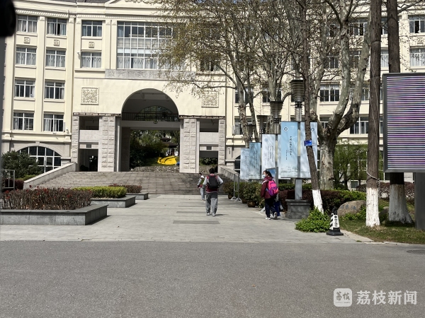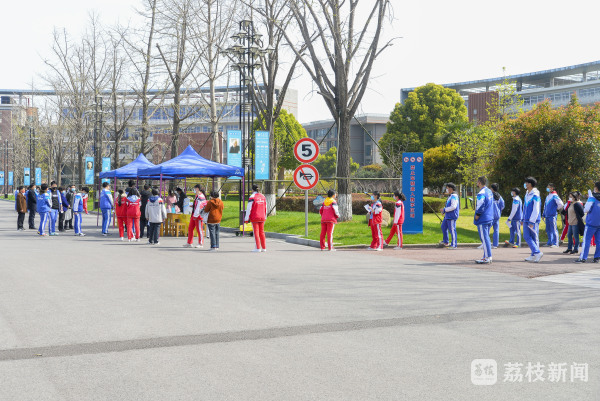 中午12点多,在南京师范大学附属中学秦淮科技高中校园,海棠、玉兰已盛开,迎接着每一位高三学子。校门口,老师们帮助学生们有序返校。