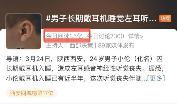 据悉,24岁男子小伦(化名)来自陕西西安,近半年来一直习惯戴耳机入睡,直到最近感到听觉丧失伴随耳鸣症状,去医院检查才得知自己这个习惯竟造成了左耳感音神经性听觉丧失。一经报道,此话题以1.5亿阅读量迅速冲上热搜受到网友们的关注。不少网友纷纷表示自己也有戴耳机睡觉的习惯,也有人提出“定时关闭行不行呢,不听点真的睡不着。”