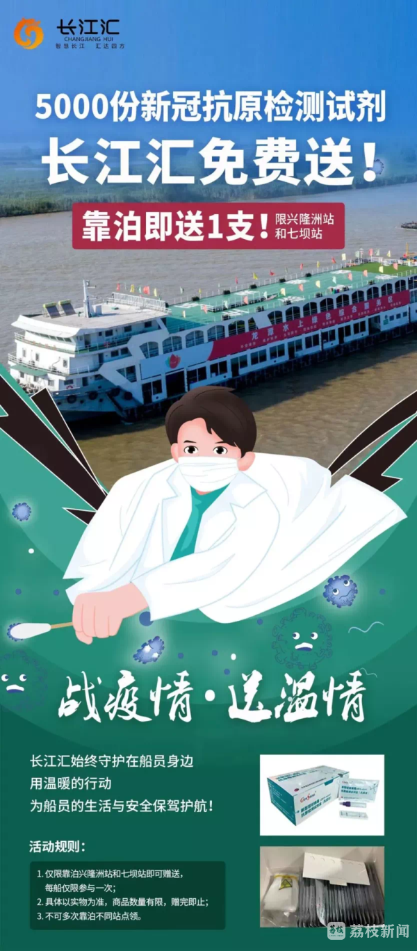 对于工作、生活在水上的船员来说,由于交通不便,上岸做核酸不方便。近日,南京长江汇兴隆洲水上绿色航运综合服务区急购了5000份获批新冠抗原检测试剂盒,免费赠送给过往船只,为疫情防控、船员健康保驾护航。
