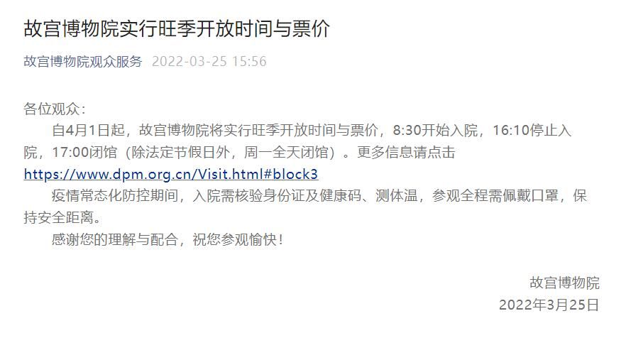 荔枝新闻讯 据故宫博物院观众服务微信公众号消息,自4月1日起,故宫博物院将实行旺季开放时间与票价,8:30开始入院,16:10停止入院,17:00闭馆(除法定节假日外,周一全天闭馆)。疫情常态化防控期间,入院需核验身份证及健康码、测体温,参观全程需佩戴口罩,保持安全距离。