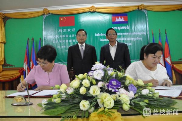 2015年12月,省血防研究所党委书记卞荷娟(左一)与西哈努克省卫生局签署《西哈努克省卫生局和江苏省寄生虫病防治研究所卫生合作谅解备忘录》签字仪式,时任副省长张雷(左二)出席。