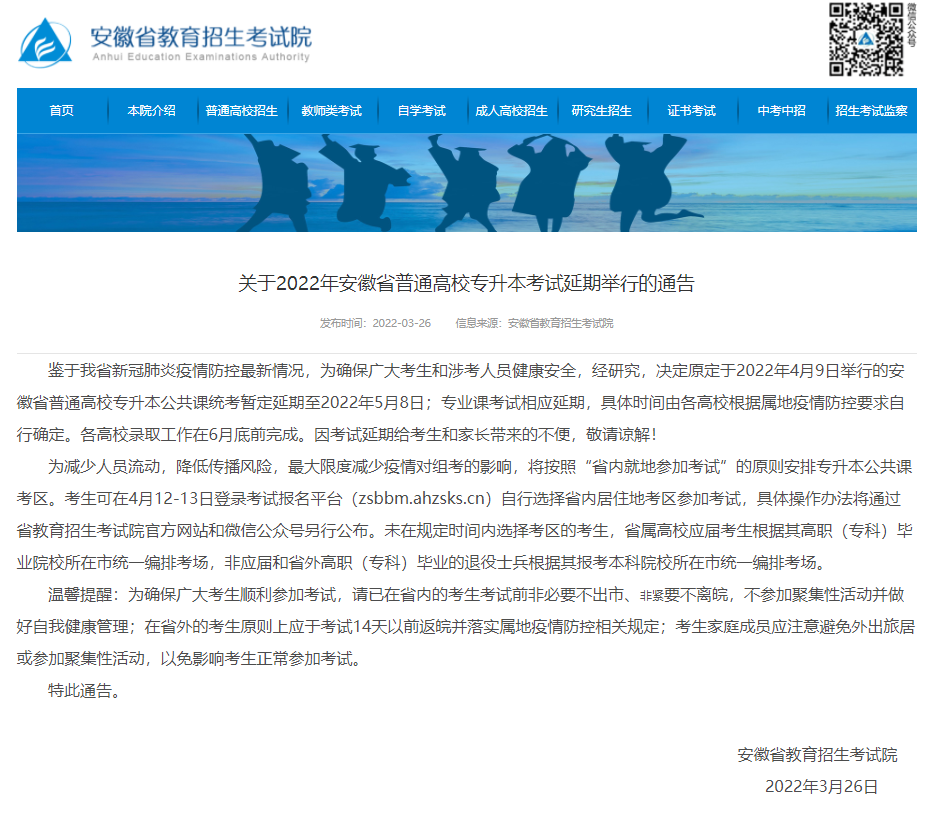 荔枝新闻讯 据安徽省教育招生考试院3月26日消息,鉴于安徽省新冠肺炎疫情防控最新情况,为确保广大考生和涉考人员健康安全,经研究,决定原定于2022年4月9日举行的安徽省普通高校专升本公共课统考暂定延期至2022年5月8日;专业课考试相应延期,具体时间由各高校根据属地疫情防控要求自行确定。各高校录取工作在6月底前完成。因考试延期给考生和家长带来的不便,敬请谅解!