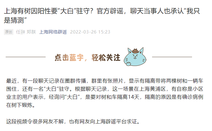 上海辟谣平台还电话联系上网传聊天记录中表示“有确诊人员天天在这两棵树这里锻炼”的当事人张先生(化名)。接到记者电话后,他希望能帮助澄清:“我只是猜测原因,并没有说树是阳性,可能误导了公众。”