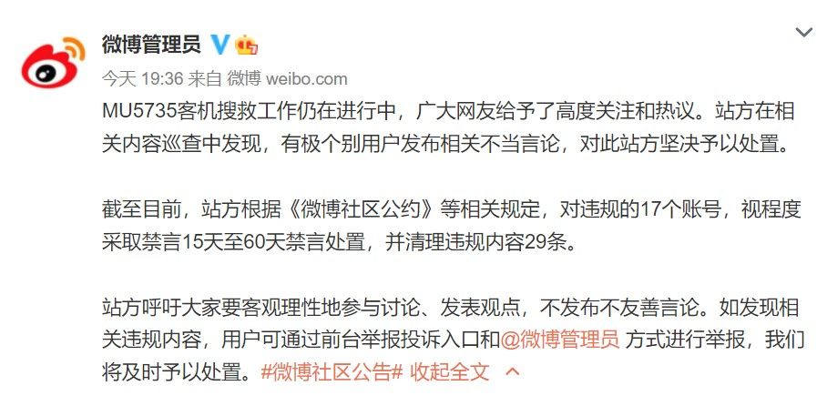 荔枝新闻讯 据微博管理员发布的消息称,MU5735客机搜救工作仍在进行中,广大网友给予了高度关注和热议。站方在相关内容巡查中发现,有极个别用户发布相关不当言论,对此站方坚决予以处置。