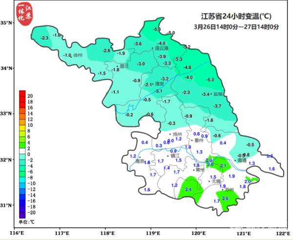据江苏省气象台发布的消息:今天江苏东北部地区气温降幅3至4℃,明天冷空气“余威”影响,升温不明显。东部地区14至15℃,其他地区17℃左右。