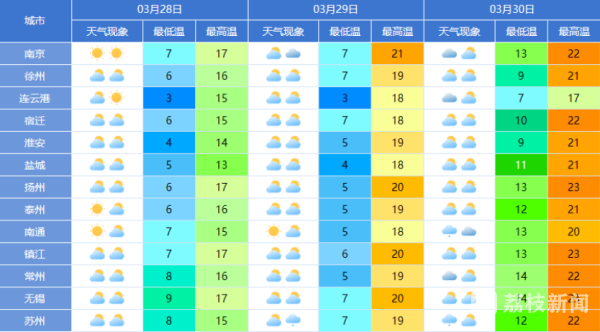 气象部门提醒:春日气温“乍暖还寒”,苏南地区最低7至8℃,其他地区5℃,29日早晨本省东部地区低至3℃左右,部分地区有霜或霜冻。大家穿衣一定要注意保暖,以防受凉。