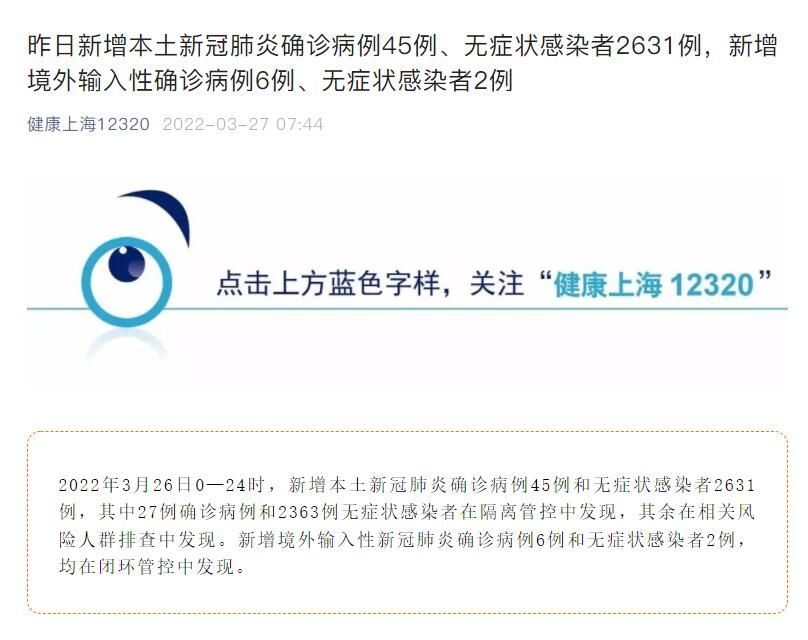 荔枝新闻讯 据健康上海12320微信公众号消息,2022年3月26日0—24时,新增本土新冠肺炎确诊病例45例和无症状感染者2631例,其中27例确诊病例和2363例无症状感染者在隔离管控中发现,其余在相关风险人群排查中发现。新增境外输入性新冠肺炎确诊病例6例和无症状感染者2例,均在闭环管控中发现。