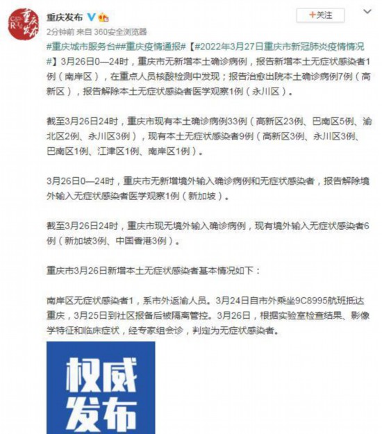 截至3月26日24时,重庆市现有本土确诊病例33例(高新区23例、巴南区5例、渝北区2例、永川区3例),现有本土无症状感染者9例(高新区3例、永川区3例、巴南区1例、江津区1例、南岸区1例)。