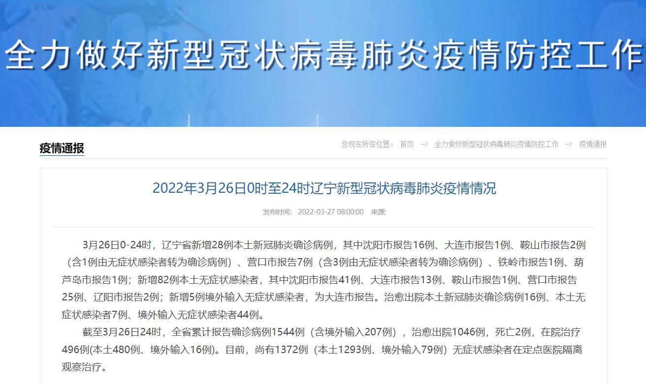 截至3月26日24时,辽宁省累计报告确诊病例1544例(含境外输入207例),治愈出院1046例,死亡2例,在院治疗496例(本土480例、境外输入16例)。目前,尚有1372例(本土1293例、境外输入79例)无症状感染者在定点医院隔离观察治疗。