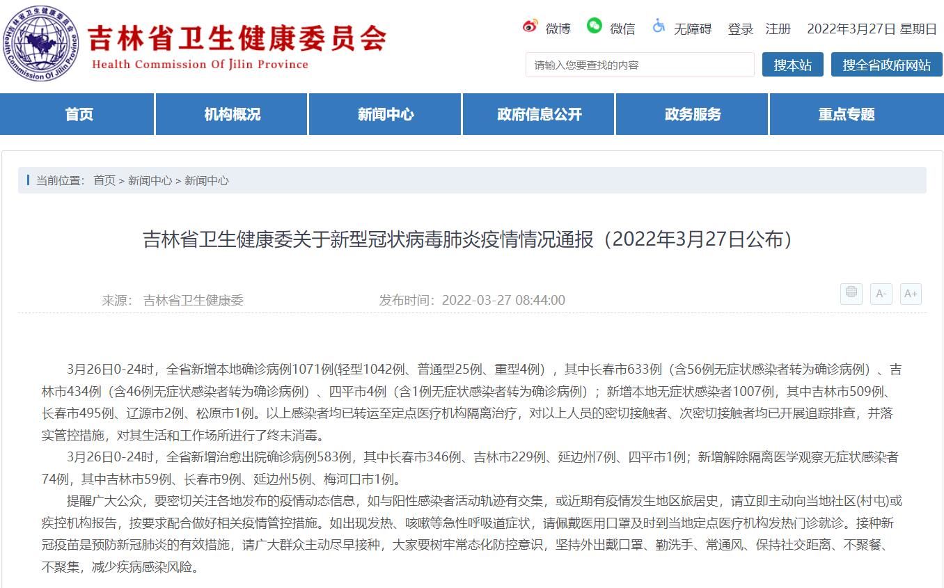 3月26日0—24时,吉林全省新增治愈出院确诊病例583例,其中长春市346例、吉林市229例、延边州7例、四平市1例;新增解除隔离医学观察无症状感染者74例,其中吉林市59例、长春市9例、延边州5例、梅河口市1例。