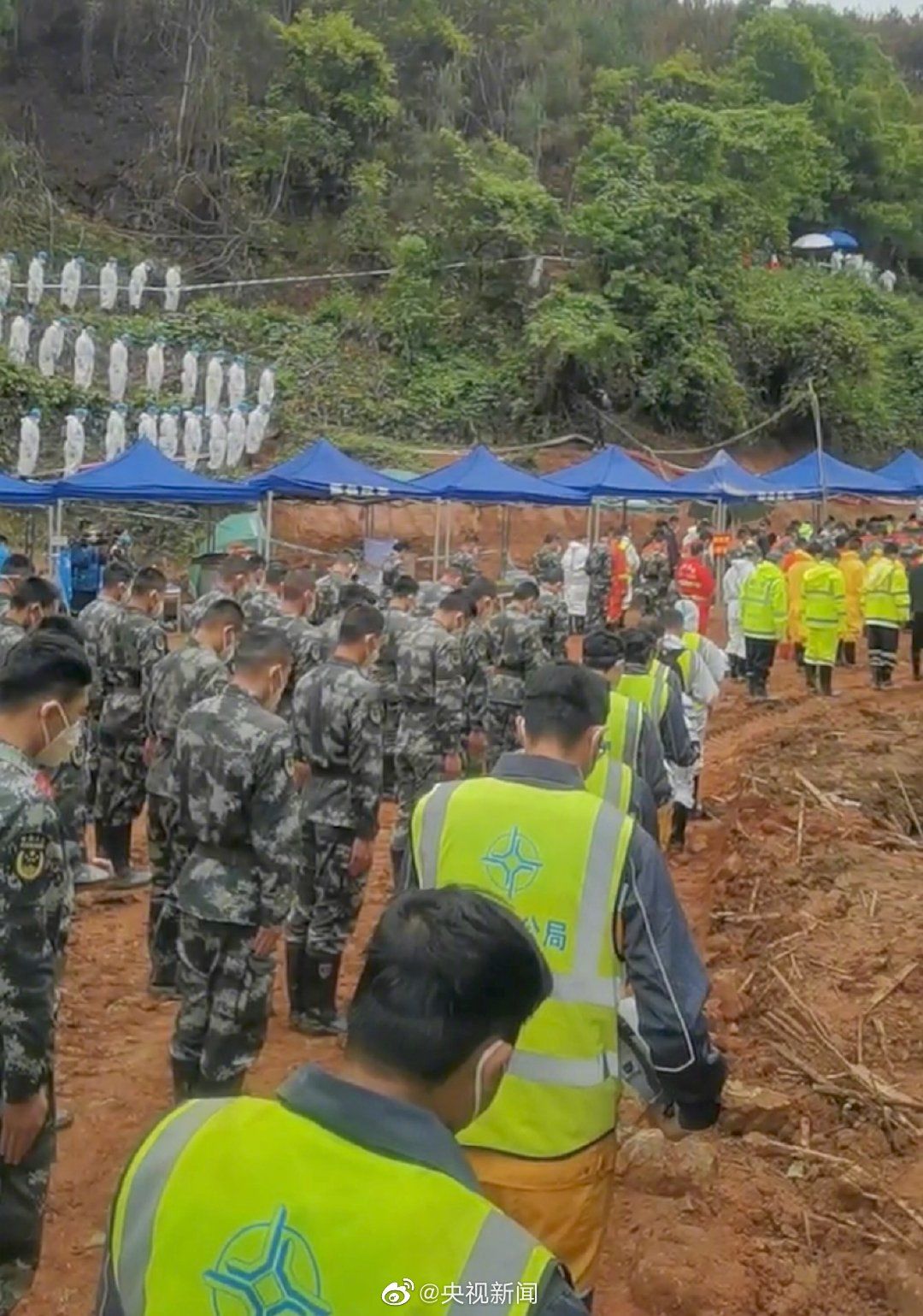 3月27日14时许,哀悼活动开始,全场鸣笛,“3·21”东航MU5735航空器飞行事故国家应急处置指挥部全体人员、事故现场搜救人员等面向遇难飞机方向肃穆而立,默哀三分钟,以此寄托对遇难者的哀思。