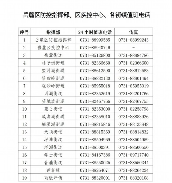 附件:岳麓区防控指挥部、区疾控中心、各街镇值班电话