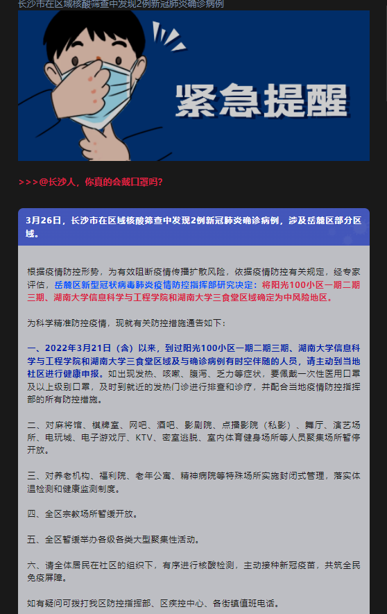 一、2022年3月21日(含)以来,到过阳光100小区一期二期三期、湖南大学信息科学与工程学院和湖南大学三食堂区域及与确诊病例有时空伴随的人员,请主动到当地社区进行健康申报。如出现发热、咳嗽、腹泻、乏力等症状,要佩戴一次性医用口罩及以上级别口罩,及时到就近的发热门诊进行排查和诊疗,并配合当地疫情防控指挥部的所有防控措施。
