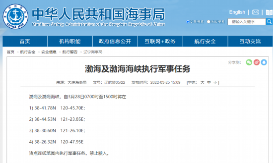 据中国海事局网站消息,渤海及渤海海峡,自3月28日0700时至1500时将在