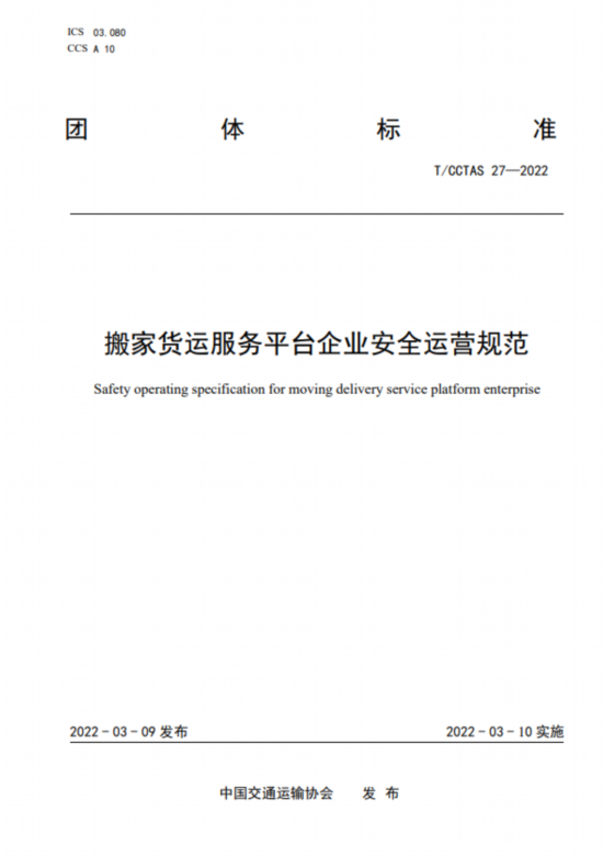 近日,我国首个《搬家货运服务平台企业安全运营规范》(以下简称《规范》 )团体标准正式发布,《规范》涉及搬家货运服务多个环节,通过明确事前防范、事中监控和事后监管,帮助平台企业和搬家货运企业形成完整闭环的安全运营体系,实现全方位保障搬家货运服务各环节主体的权益。