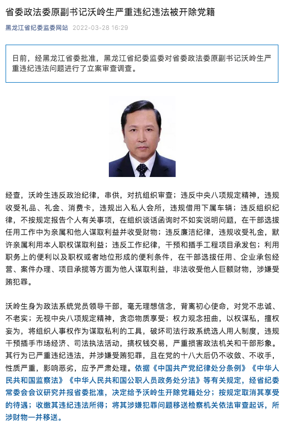 荔枝新闻讯 据黑龙江省纪委监委消息,日前,经黑龙江省委批准,黑龙江省纪委监委对省委政法委原副书记沃岭生严重违纪违法问题进行了立案审查调查。