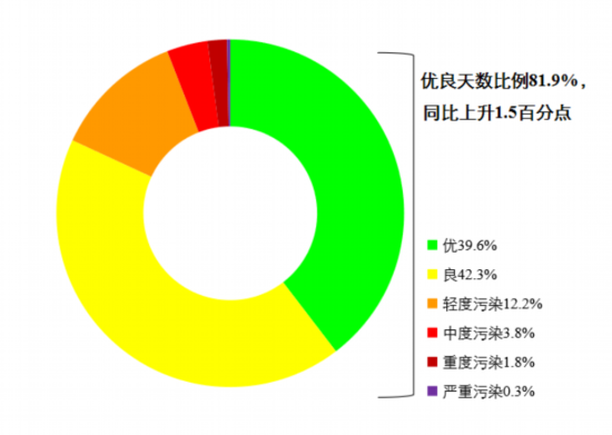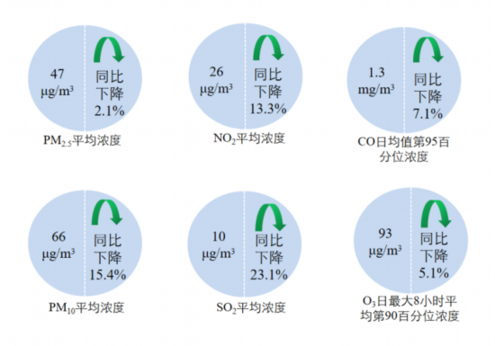 1—2月,全国339个地级及以上城市平均空气质量优良天数比例为81.9%,同比上升1.5个百分点;PM2.5平均浓度为47微克/立方米,同比下降2.1%;PM10平均浓度为66微克/立方米,同比下降15.4%;O3平均浓度为93微克/立方米,同比下降5.1%;SO2平均浓度为10微克/立方米,同比下降23.1%;NO2平均浓度为26微克/立方米,同比下降13.3%;CO平均浓度为1.3毫克/立方米,同比下降7.1%。
