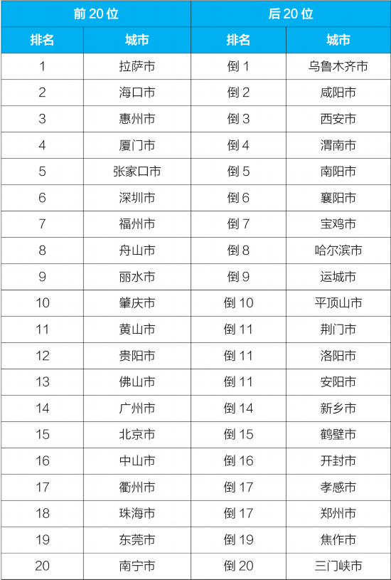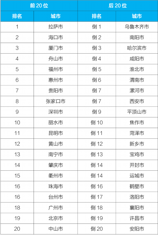 1—2月,168个重点城市中,拉萨、海口和厦门市等20个城市空气质量相对较好(从第1名至第20名);乌鲁木齐、南阳和哈尔滨市等20个城市空气质量相对较差(从倒数第1名至倒数第20名),见附表2。