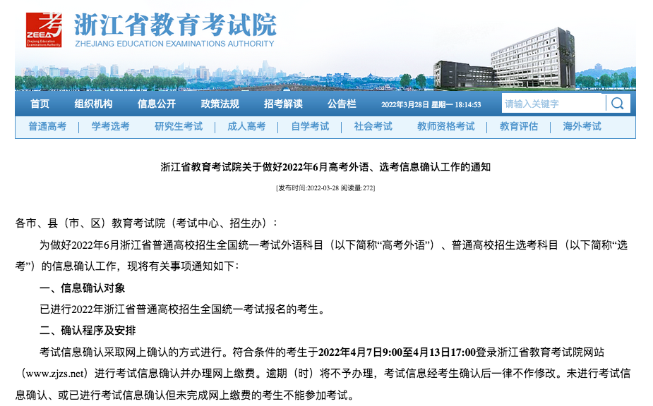 为做好2022年6月浙江省普通高校招生全国统一考试外语科目(以下简称“高考外语”)、普通高校招生选考科目(以下简称“选考”)的信息确认工作,现将有关事项通知如下:
