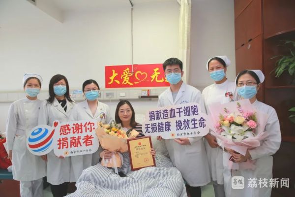 3月17日,林娇在红十字会工作人员陪同下来到江苏省中医院血液科办理了住院手续,科主任孙雪梅带领医疗团队全程跟进,确保采集顺利进行。“听说了林娇为素不相识的人捐献造血干细胞的事,大家都被她无私大爱所感动。”入院当天,孙主任带领护士长余娟、主治医师庞洁等医护人员为林娇举行了简短的欢迎仪式,并送上了一束美丽的鲜花。