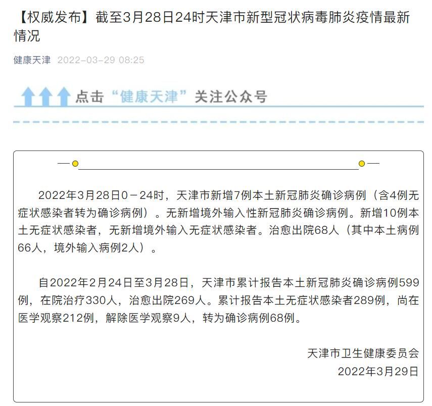 自2022年2月24日至3月28日,天津市累计报告本土新冠肺炎确诊病例599例,在院治疗330人,治愈出院269人。累计报告本土无症状感染者289例,尚在医学观察212例,解除医学观察9人,转为确诊病例68例。