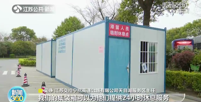 江苏交控宁杭高速公路有限公司天目湖服务区主任吴铮说:“我们将进一步地做好24小时便民服务,努力为他们提供一些生活基本补给,以及解决如厕的问题,过夜的滞留人员,我们的集装箱可以为他们提供24小时休息服务。”