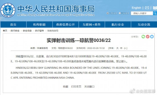 据中国海事局网站消息,洋浦海事局发布航行警告,3月30日7时至4月1日18时,北部湾部分海域进行实弹射击训练,禁止驶入。