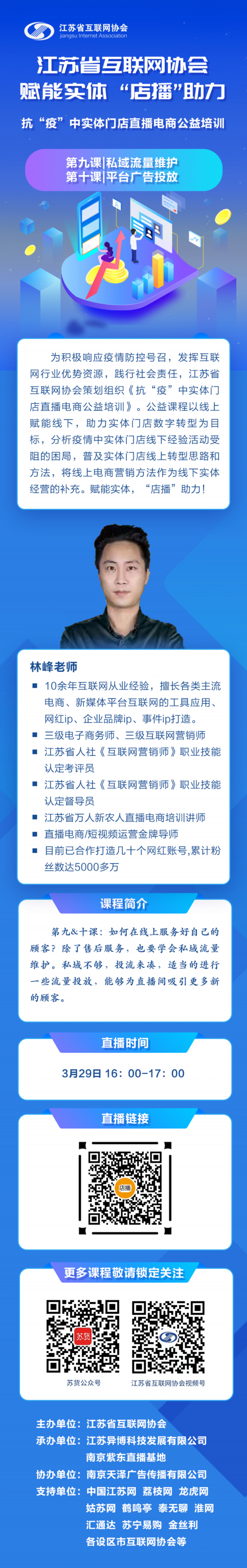 为积极响应疫情防控号召,发挥互联网行业优势资源,践行社会责任,江苏省互联网协会策划组织《抗“疫”中实体门店直播电商公益培训》。公益课程以线上赋能线下,助力实体门店数字转型为目标,分析疫情中实体门店线下经验活动受阻的困局,普及实体门店线上转型思路和方法,将线上电商营销方法作为线下实体经营的补充。赋能实体,“店播”助力!