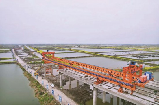 在建兴高速公路项目泰州段横泾河特大桥的建设现场,一体化架桥机正在紧张施工。 邱 骏 沈桂平供图