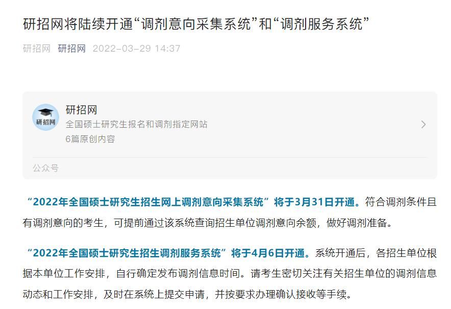 荔枝新闻讯 据研招网微信公众号3月29日消息,“2022年全国硕士研究生招生网上调剂意向采集系统”将于3月31日开通。符合调剂条件且有调剂意向的考生,可提前通过该系统查询招生单位调剂意向余额,做好调剂准备。