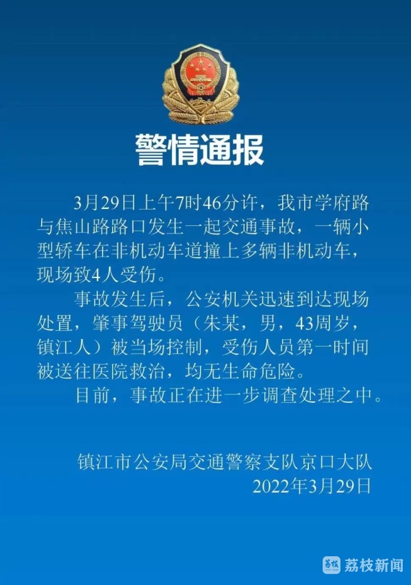 随后,镇江市公安局交通警察支队京口大队发布通报称,此起事故致4人受伤。肇事驾驶员朱某,已被警方当场控制,受伤人员被送往医院救治,均无生命危险。