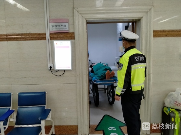 送到医院后,民警帮助医护人员将孕妇抱上担架推进急救室,家属对民警连连称赞!