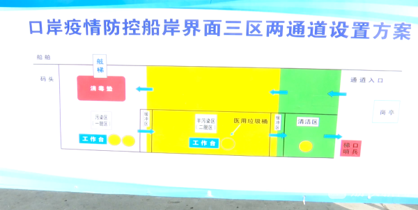 在常熟港兴华码头,工作人员正在泊位前加紧设置“三区两通道”。确保国际远洋船舶停靠后,人流、物流、空气流与其他区域严格物理隔离,筑牢防疫防线。
