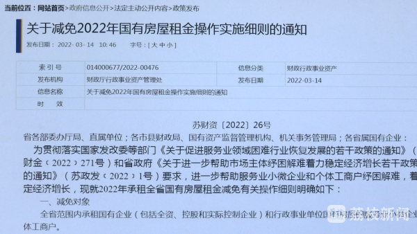 在3月初,江苏就展开了国有房屋租金减免举措,房租减免的对象是全省范围内承租国有企业和行政事业单位国有房屋的服务业小微企业和个体工商户。国有房屋所在县级行政区2022年未被列入中高风险地区的, 2022年3月至5月租金全免,累计减免3个月租金。政策出台后及目前已被列为中高风险地区的,再顺延或从当月起追加减免3个月租金,共减免6个月,减免期到2022年12月31日止。江苏省国资委财务考核处处长唐燕萍表示,已经召开视频会议对省属企业和各地国资委进行布置,力争在今年上半年全部落实。