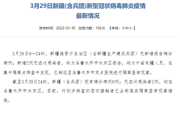 荔枝新闻讯 据新疆维吾尔自治区卫生健康委最新通报,3月29日0时至24时,新疆维吾尔自治区(含新疆生产建设兵团)无新增新冠肺炎确诊病例;新增2例无症状感染者,均为乌鲁木齐市米东区报告,均为外省来疆人员,在集中隔离点筛查中发现,已转运至乌鲁木齐市定点医院进行隔离医学观察。
