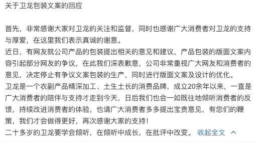荔枝新闻讯 3月30日, 卫龙通过官方微博@卫龙美味 回应卫龙争议包装文案称,近日,有网友就公司产品的包装提出相关的意见和建议,产品包装的版面文案内容引起部分网友的争议,在此深表歉意。公司非常重视广大网友和消费者的意见,决定停止有争议文案包装的生产,同时进行版面文案及设计的优化。