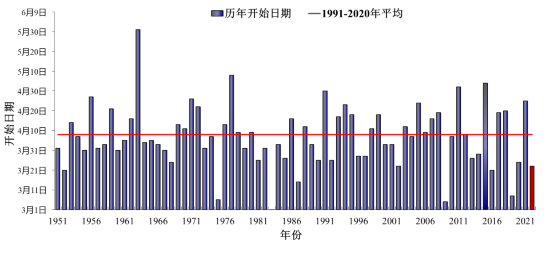 1951-2022年华南前汛期开始时间。来源:国家气候中心