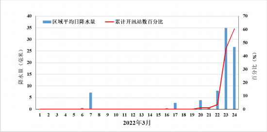 3月以来广东逐日平均降水量(单位:毫米)及累计开汛站数百分比(单位:%)。来源:国家气候中心
