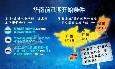 华南地区前汛期开始时间以广东、广西、福建、海南四省(自治区)中前汛期的最早开始日期为准,即四省(自治区)其中之一入汛,即可宣布华南前汛期开始。